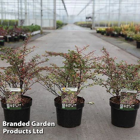 A spectacular, tri-coloured Berberis, boasting vivid summer foliage and rich autumnal shades. Bright carmine-red shoots hold leaves which emerge pink in spring then mature to cream with pink and green splashes. Before autumn leaf fall, the foliage provides another season of interest when it turns yellow-orange. Berberis thunbergii ‘Natasza’ forms a compact, spreading shrub that is robust, hardy and low maintenance. The yellow flowers in March and April are fairly inconspicuous, but rich in nectar, attracting plenty of pollinating insects to the garden, whilst birds enjoy its dense, thorny cover, making it a useful shrub for attracting wildlife. A rewarding shrub which provides bright foliage colour in small gardens and containers. Height and spread: 1 m (3 ft).