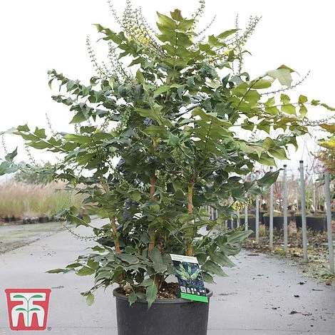 Mahonia japonica ‘Hivernant’is an evergreen, specimen shrub for the larger garden, or a mixed shrub border. This hardy shrub is cloaked in dark green, glossy, sharply toothed leaves which are paler underneath. Scented, lemon yellow flowers form arching racemes from November through to March. Dark purple-blue berries follow through to summer. Mahonia prefer a shady site but will tolerate sun if the soil does not dry out. Perfect for woodland gardens or as a security plant. Height and spread: 2.5m (8’).