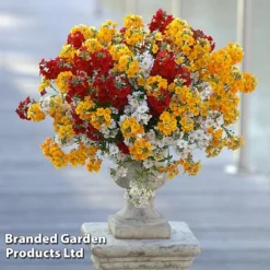 Create a kaleidoscope of springtime colour with Viola ‘Sorbet XP T&M’. This uniform mix is prolific and free flowering with a neat, uniform habit that is perfectly suited to hanging baskets, window boxes and containers. Height: 20cm (8″). Spread: 23cm (9″).